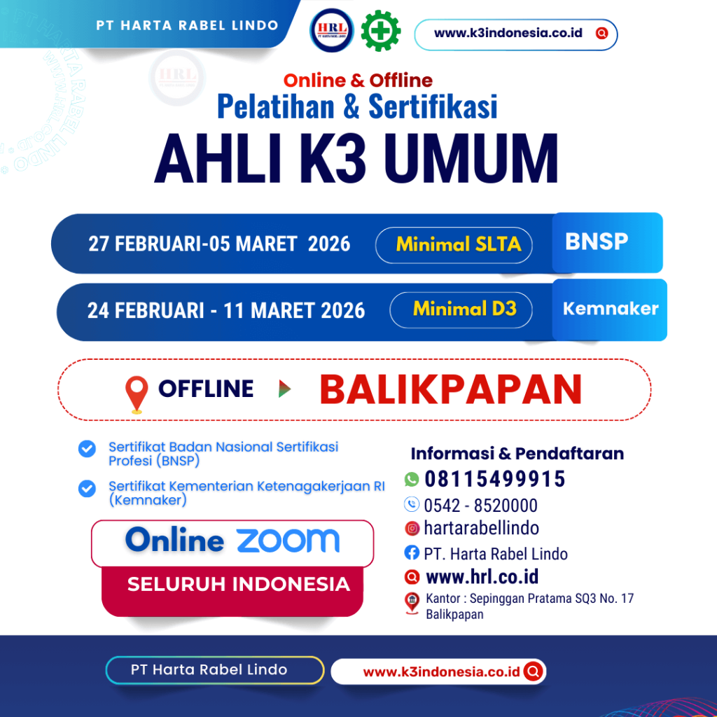 Dari seluruh Indonesia Pelatihan dan Sertifikasi Ahli K3 Umum Kemnaker RI dengan syarat minimal D3 dan Ahli K3 Umum BNSP minimal SLTA sederajat yang dilaksanakan PJK3 PT Harta Rabel Lindo yang memiliki ijin pelaksanaan dari Kementerian Ketenagakerjaan Republik Indonesia sebagai Perusahaan Jasa K3 Pembinaan dan juga sebagai Tempat Uji Kompetensi . Pelaksanaan uji kompetensi yang dilaksanakan diakhir kegiatan semua peserta dibimbing dan dibina selama kegiatan termasuk untuk menuju proses-proses ujian negara atau uji kompetensi.